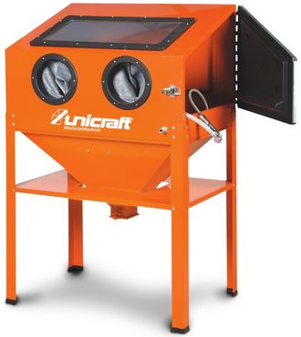 - Пневматическая пескоструйная камера с большой дверцей для загрузки и выгрузки деталей, встроенным светильником и воздухоотводом с фильтром.